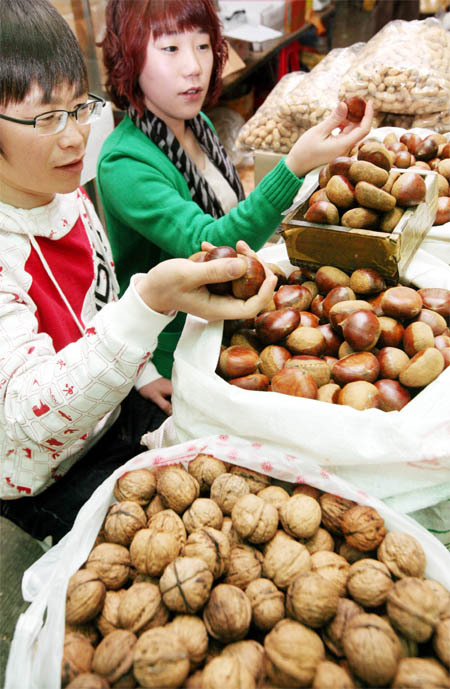 정월대보름을 일주일가량 앞둔 21일 전주 남부시장의 한 건어물상점에서 시민들이 1년 동안 무사태평하고 만사가 뜻대로 되기를 기원하는 의미에서 깨무는 부럼을 고르고 있다.