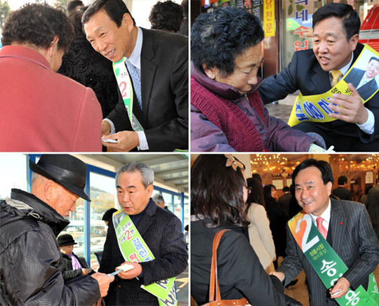 도 선관위에 지난 19일 예비후보로 등록을 마친 정읍시장 후보들이 첫 주말을 맞아 교회, 시장, 예식장, 터미널 등지에서 지지를 호소하고 있다. 왼쪽 위부터 시계방향으로 김생기, 김용채, 송완용, 허준호 예비후보.