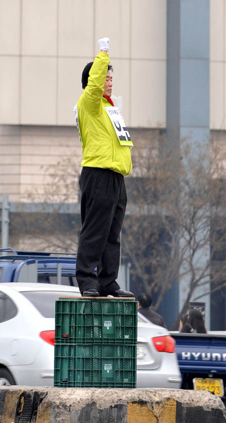 6.2 지방선거 출마 예정자인 한 예비후보가 22일 전주시내 한복판에서 손을 번쩍들고 지지를 호소하고 있는 모습이 동계 올림픽 시상대를 연상케 하고 있다.
