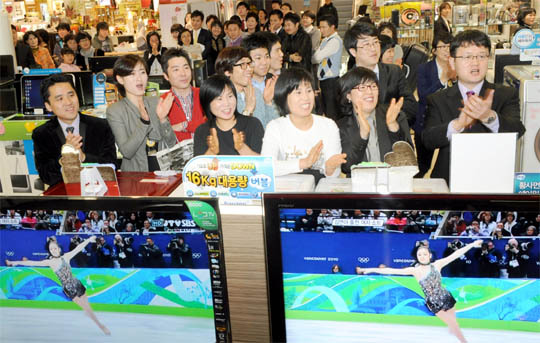24일 오후 2010 밴쿠버 동계올림픽 피겨 여자 싱글에 출전한 피겨여왕 김연아의 연기를 지켜보기 위해 롯데백화점 전주점 가전매장을 찾은 시민들이 환상적인 연기에 박수를 치고 있다.