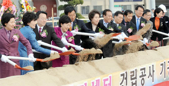 24일 전주 종합경기장에서 열린 여성일자리센터 기공식에서 참석자들이 시삽을 하고 있다.