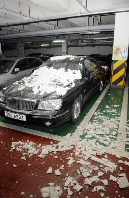 [포토뉴스] 도청 지하추차장 천장서 암면 떨어져 차량 덮어