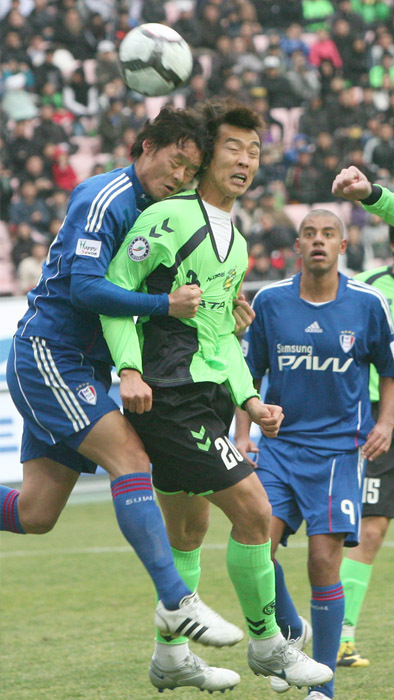 27일 전주월드컵경기장에서 열린 K리그 개막전 전북현대와 수원삼성의 경기에서 이동국 선수가 상대편 수비수와 공중 볼다툼을 하고 있다.