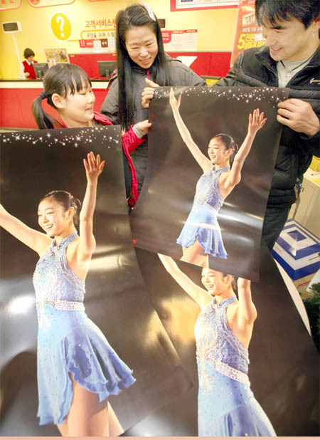 2일 홈플러스 전주점에서 고객들이 피겨 퀸 김연아 선수의 포스터를 받고 즐거워하고 있다. 홈플러스에서 나눠주는 김연아 포스터는 문구류 1만 원 이상 구매고객에 한정된다.