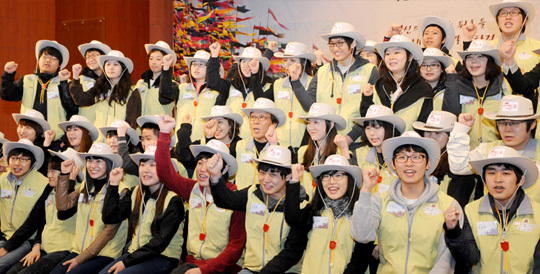 2일 전북도청 강당에서 열린 새만금 깃발축제 사전프로모션 희망원정대 발대식에서 희망원정대원들이 파이팅을 하고 있다.