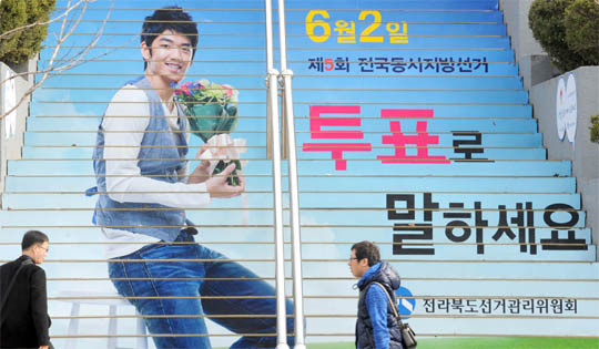 3일 전주고속버스터미널 계단에 오는 6월2일에 치뤄지는 제5회 전국동시지방선거에 시민들의 참여를 호소하는 홍보문이 걸려있다.