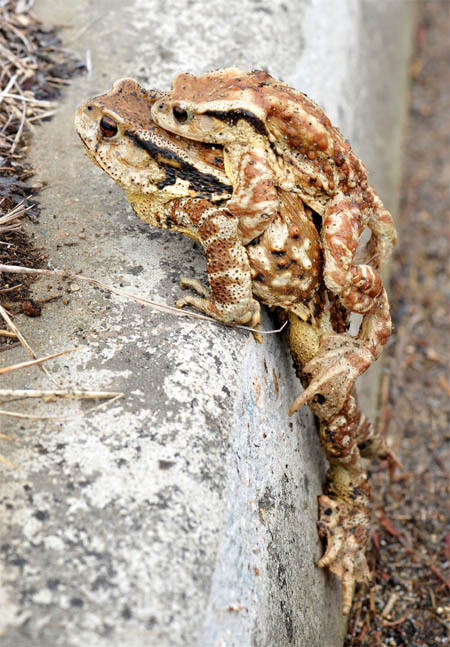 경칩을 이틀 앞둔 4일 겨울잠에서 깨어난 두꺼비 한쌍이 완주군 신리 도로변 경계석을 넘어 물을 찾아 이동하고 있다.