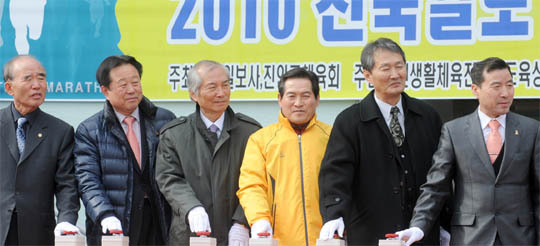전북일보 마이산 전국마라톤대회 참석 인사들이 출발 버튼을 누르고 있다.