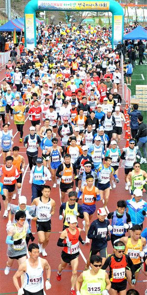 2010 전북일보 마이산 전국마라톤대회가 7일 진안공설운동장에서 열려 30Km 코스에 출전한 선수들이 힘찬 출발을 하고있다.