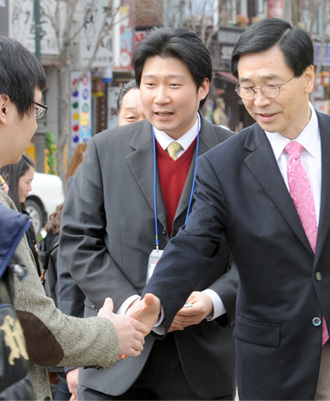 유종근 전 전북도지사가 8일 전북대 구정문 앞에서 민주당 도지사 선거에 나선 자신의 막내동생 유종일 예비후보의 길거리 선거운동을 하고 있다.