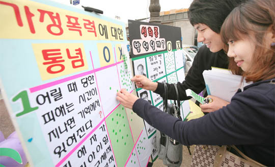 세계 여성의 날이었던 8일 전북대학교 구 정문 앞에서 대학생들이 가정폭력과 성희롱에 관한 설문에 참여하고 있다