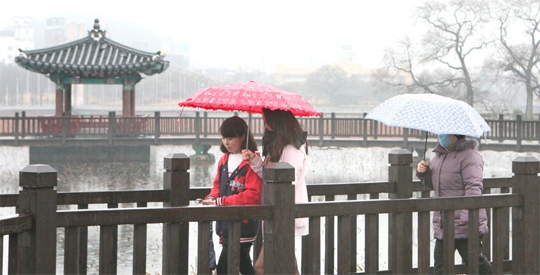 쌀쌀한 날씨에 촉촉히 비가 내린 9일 전주 덕진공원을 찾은 시민들이 우산을 받고 연못에 설치된 다리 를 건너고 있다.