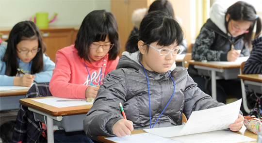 초등학교 3-5학년과 중학교 1-2학년을 대상으로 한 올해 첫 교과학습 진단평가가 실시된 9일 전주의 한 초등학교에서 학생이 문제풀이를 하고 있다.
