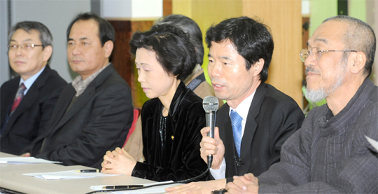 9일 전북농업인회관에서 시민·사회 단체 등으로부터 제16대 전북교육감선거 범민주후보로 추대된 김승환 전북대학교 법학전문대학원 교수(오른쪽 두번째)가 출마의 변을 밝히고 있다.