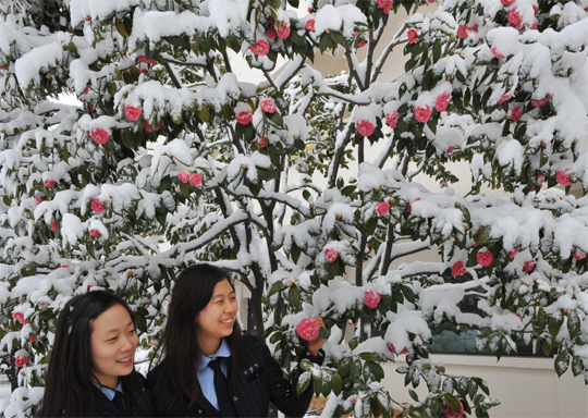 10일 꽃샘추위가 엄습한 도내에 많은 눈이 내린 가운데 전주 상산고 여학생이 교정에 핀 분홍 동백꽃을 만지며 환하게 웃고 있다.