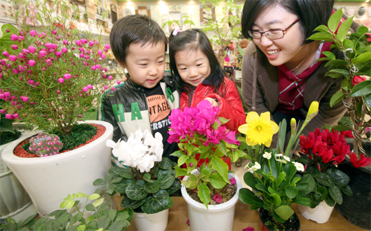 반짝 꽃샘추위가 지나간 11일 홈플러스전주점 화원에서 엄마와 아이들이 봄꽃을 구경하고 있다.