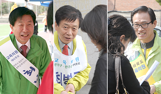 전라북도 전주시 완산구 완주군 교육의원에 출마하는 예비후보자들이 자신의 지지를 호소하며 유권자에게 명함을 돌리고 있다. 왼쪽부터 최남렬 최병균 권징홍 예비후보