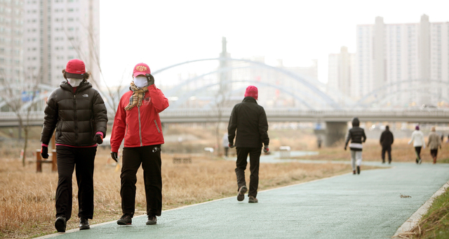 16일, 올 들어 첫 황사주의보가 내려지는 등 황사가 전국을 뒤덮은 가운데 전주시민들이 낮아진 기온과 황사로 인해 마스크를 착용하고 천변로를 걷고 있다.