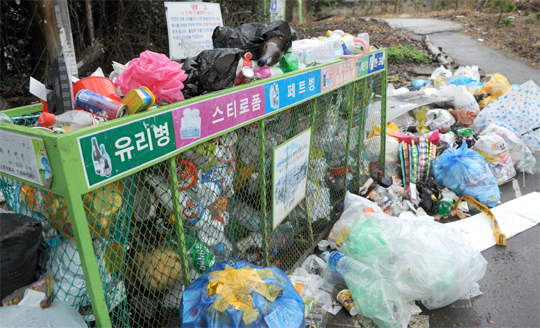 지난 15일 오전 전북대 인근 원룸촌 골목에 놓인 재활용 폐기물 분리수거함에 규격봉투에 담아야 할 일반 쓰레기들이 가득 차 있고 분리수거함 주변에는 각종 쓰레기가 널려 있다.