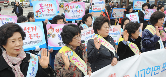 22일 전주 오거리 문화광장에서 전라북도 여성단체협의회 소속 단체 회원들이 돈선거 근절 결의대회 및 캠페인을 하고 있다.