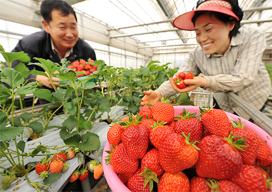 완주 삼례 딸기의 맛과 품질을 위한 '제14회 삼례딸기 축제' 개막을 하루 앞둔 25일 김윤흥·정미애 부부가 축제에 내놓을 딸기를 수확하며 환하게 웃고 있다. 28일까지 완주군청소년수련관 야외공연장에서 열리는 이번 축제에는 수확체험과 어린이 그림 그리기 대회 등 다양한 행사가 진행된다.