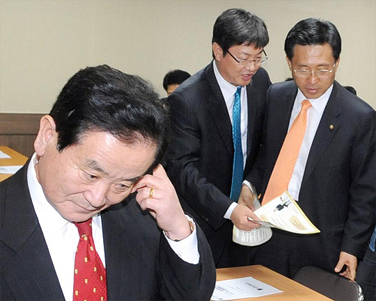 민주당 전라북도당 2010년도 제3차 상무위원회 회의가 지난 26일 전북도당에서 열린 가운데 강봉균 위원장이 회의 진행 상황이 답답한 듯 머리를 만지고 있다.