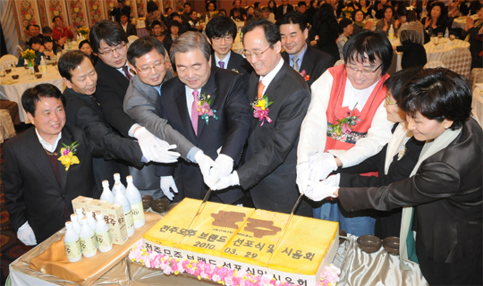 29일 전주 리베라호텔에서 열린 전주 모주 브랜드 선포식에서 송하진 시장과 최찬욱의장 하수오 전주주조 대표와 참석자들이 떡 케익을 자르고 있다.