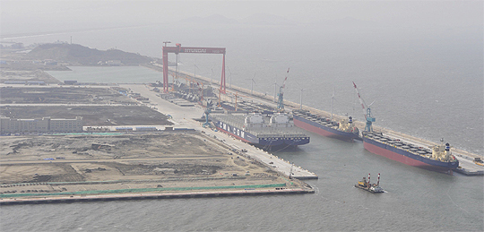 31일 준공식을 갖는 현대중공업 군산조선소의 전경. 사진은 지난 26일 안개가 낀 상태에서 헬기에서 촬영한 조선소.