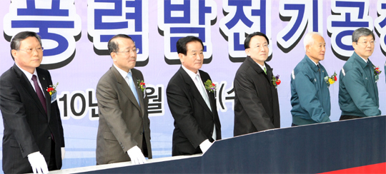 31일 현대중공업 군산조선소 및 풍력발전기 공장 준공식에서 민계식 회장과 이재성 사장, 김완주 도지사, 강봉균 국회의원 등이 함께했다.