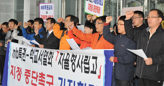 1일 사회공공성·공교육강화 전북네트워크 회원들이 도교육청 앞에서 '자율형사립고 지정 신청서 즉각 반려'를 촉구하는 기자회견을 하고 있다.