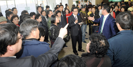 지난 3일 전주 풍림아이원 모델하우스에서 시민들이 분양금지가처분에 항의하고 있다.