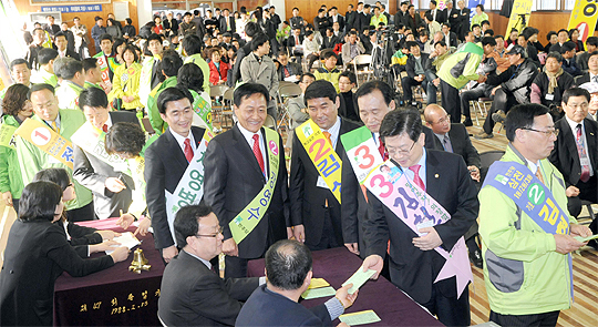 3일 전주 서신초등학교 강당에서 열린 민주당 전주완산을 광역·기초의원 후보선출 선거인단 대회에서 후보자들이 투표를 하기위해 길제 줄을 서 있다.
