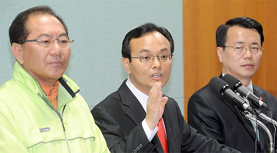5일 민주당 완주군수 예비후보자들이 도의회에서 기자회견을 열고 중앙당 공심위원장 명의로 발송된 공문서에 대한 진위여부와 책임소재 규명을 촉구하고 있다. 왼쪽부터 이길용, 이동진, 이돈승 예비후보.