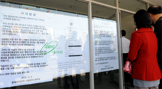 전주 효자동 풍림아이원 모델하우스 앞에서 시민들이 분양중지 사과문을 보고 있다.