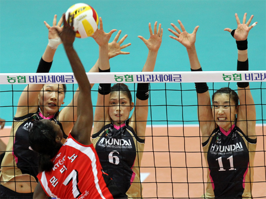 8일 수원실내체육관에서 열린 여자 프로배구 챔피언결정 2차전 KT&G와 현대건설의 경기에서 KT&G 몬타뇨가 현대건설 한유미, 김수지, 한수지(오른쪽부터) 3인 블로킹을 앞에 두고 스파이크를 날리고 있다.