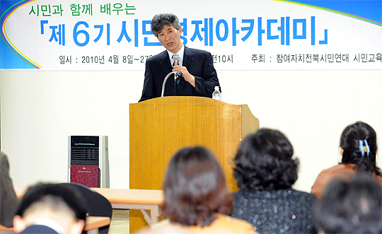 [포토뉴스] 시민경제아카데미서 강연하는 강준만 교수