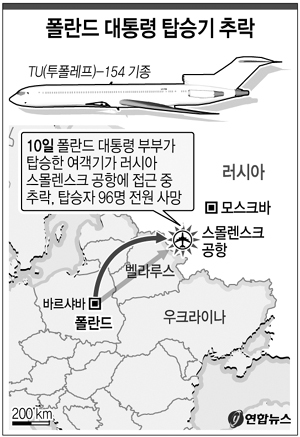 레흐 카친스키 폴란드 대통령 부부 등이 탑승한 비행기가 러시아 서부 스몰렌스크 공항에 접근하던 중 추락,탑승자 96명 전원이 사망했다고 10일 러시아 당국이 밝혔다.