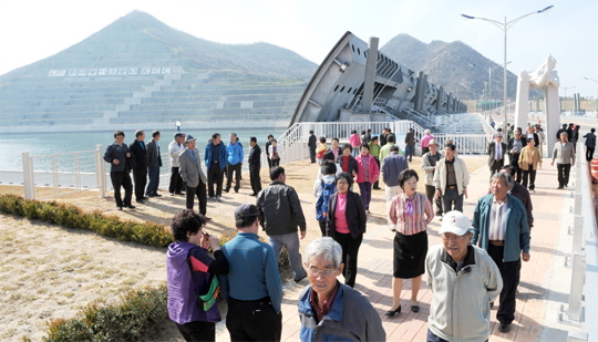 새만금 방조제 개통을 20여일 앞둔 9일 새만금 신시도 배수관문에는 전국 각지에서 찾아온 관광객들로 북적였다. 배수관문을 둘러보고 있는 봄나들이 관광객들이 밝은 미소를 짓고 있다.