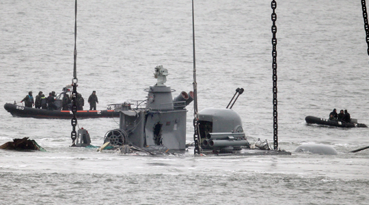 천안함 침몰사고 함미부분 인양작업중인 백령도 연화리 앞바다에서 민간해난구조업체 요원들과 해군 해난구조대 관계자들이 함미부분에 쇠사슬 2개 결색을 완료한 뒤 인양작업의 편의를 위해 함미부분을 연안쪽 수심 25m 지점으로 이동시키고 있다. 함미 일부가 모습을 드러내고 있다.