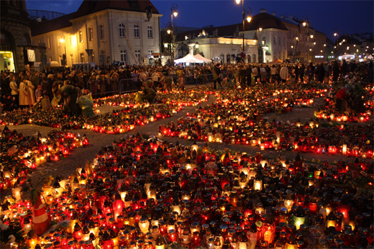 레흐 카친스키 대통령이 불의의 비행기 사고로 사망한 지 사흘째인 12일(현지시간) 바르샤바의 대통령궁 주변에는 '촛불의 바다'를 이루며 고인에 대한 추모의 열기로 가득차 있다.
