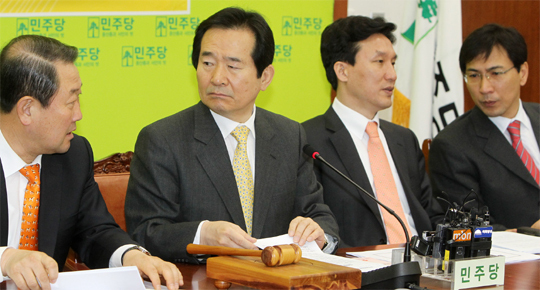 14일 오전 국회에서 열린 민주당 최고위원회의에서 정세균 대표와 박주선 최고위원, 김민석, 안희정 최고위원이 각각 이야기하고 있다.