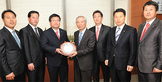 14일 전북일보를 방문한 전북지구 JC 회원들이 김남곤 사장에게 명예회원패를 전달한 가운데 기념촬영을 하고 있다.