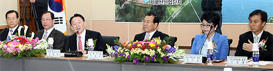 14일 김제시청에서 열린 대규모 농어업회사 협약 체결식에서 김완주 지사가 인사말을 하고 있다. 왼쪽부터 (주)동부그린바이오 차동천대표, 한국농어촌공사 한상우 이사, 전북도지사 김완주지사, 김제시청 이건식시장, 농산무역(유) 조기심 대표, (주)초록마을 이상훈 대표.