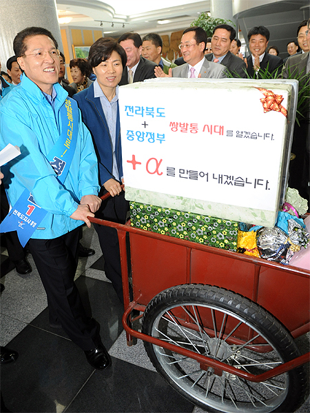 정운천 전 농림수산식품부장관이 15일 도의회에서 한나라당 전북도지사 출마 기자회견을 마치고 부인과 함께 전라북도와 중앙정부간의 쌍발통 시대를 열겠다는 퍼포먼스를 하고 있다.