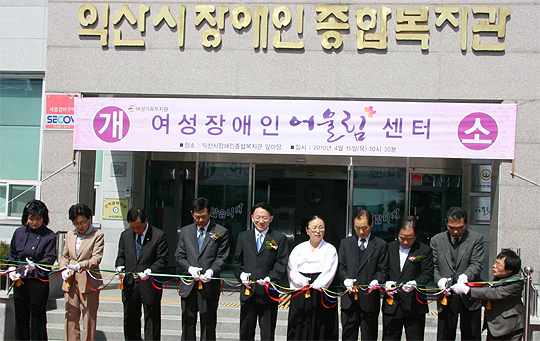 15일 익산시 인화동 장애인종합복지관 내에서 열린 여성장애인 어울림센터 개소식에서 김완주 도지사 등 참석자들이 테이프를 자르고 있다.