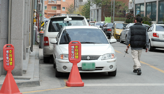 전주시 중화산동 일대의 왕복 2차선도로가 불법 주차된 차량들로 인해 몸살을 앓고 있는 가운데 한 시민이 도로 한가운데로 통행하고 있어 사고 위험까지 도사리고 있다.