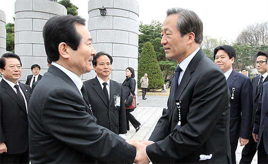 한나라당 정몽준 대표가 4.19 혁명 50주년을 맞아 19일 서울 수유리 국립 4.19 민주묘지를 참배한 후 나오다 민주당 정세균 대표를 만나 악수하고 있다.