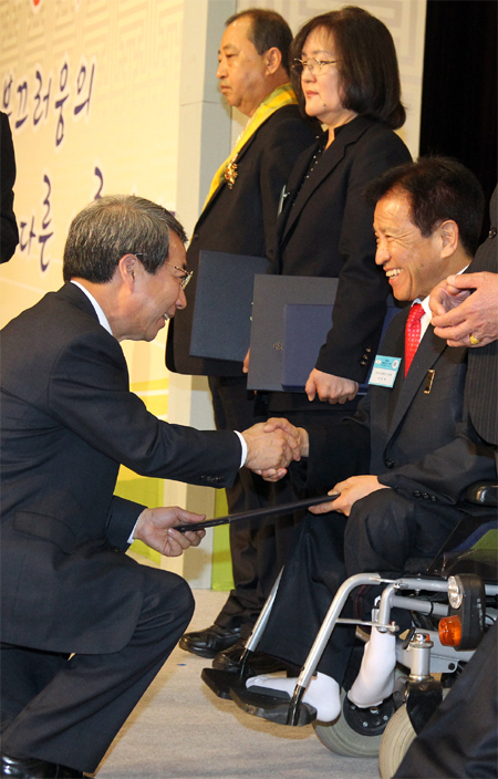 정운찬 국무총리가 20일 서울 여의도 63빌딩에서 열린 제30회 장애인의 날 기념식에서 양복규 사회복지법인 동암 대표에게 국민훈장 목련장을 수여하고 있다.
