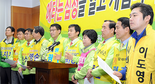민주당 전북 전주완산갑 광역 및 기초의원 예비후보 10명이 20일 도의회 브리핑룸에서 조속한 경선방식을 촉구하는 기자회견을 하고 있다.