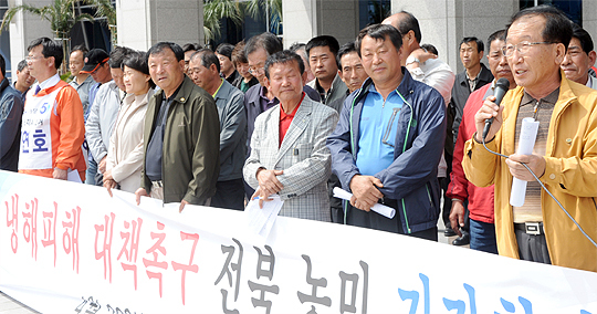 전국농민회총연맹 전북도연맹 등 전북지역 농민단체 회원들이 20일 전북도청 앞에서 정부와 각 지자체는 냉해 지역을 재조사하고 보상대책을 마련하라는 기자회견을 하고 있다.